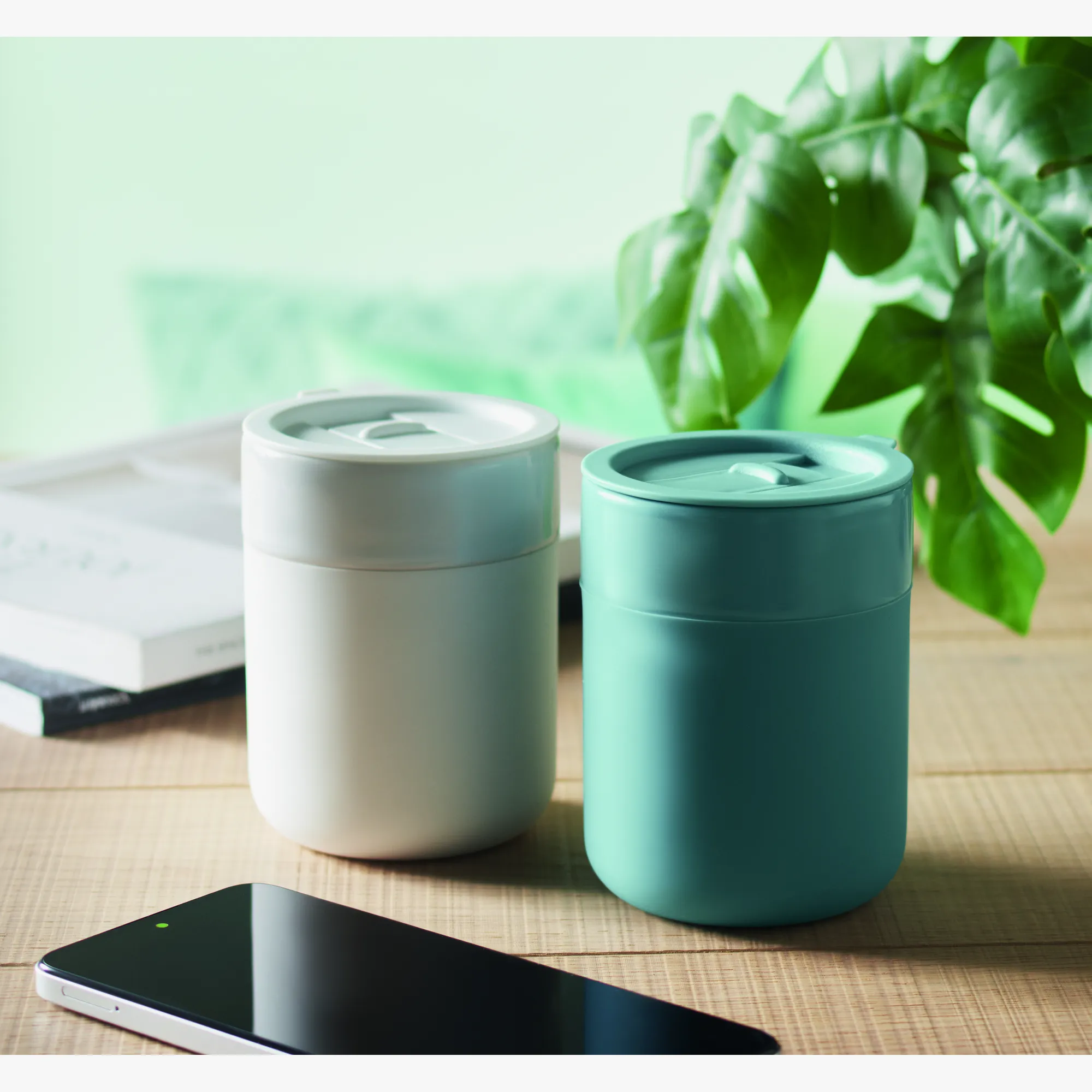 This cup combines a ceramic body with a silicone sleeve that improves grip and helps to insulate heat, plus a PP lid for comfortable drinking. It is ideal for handing out at corporate events, training sessions, or internal wellbeing programmes.