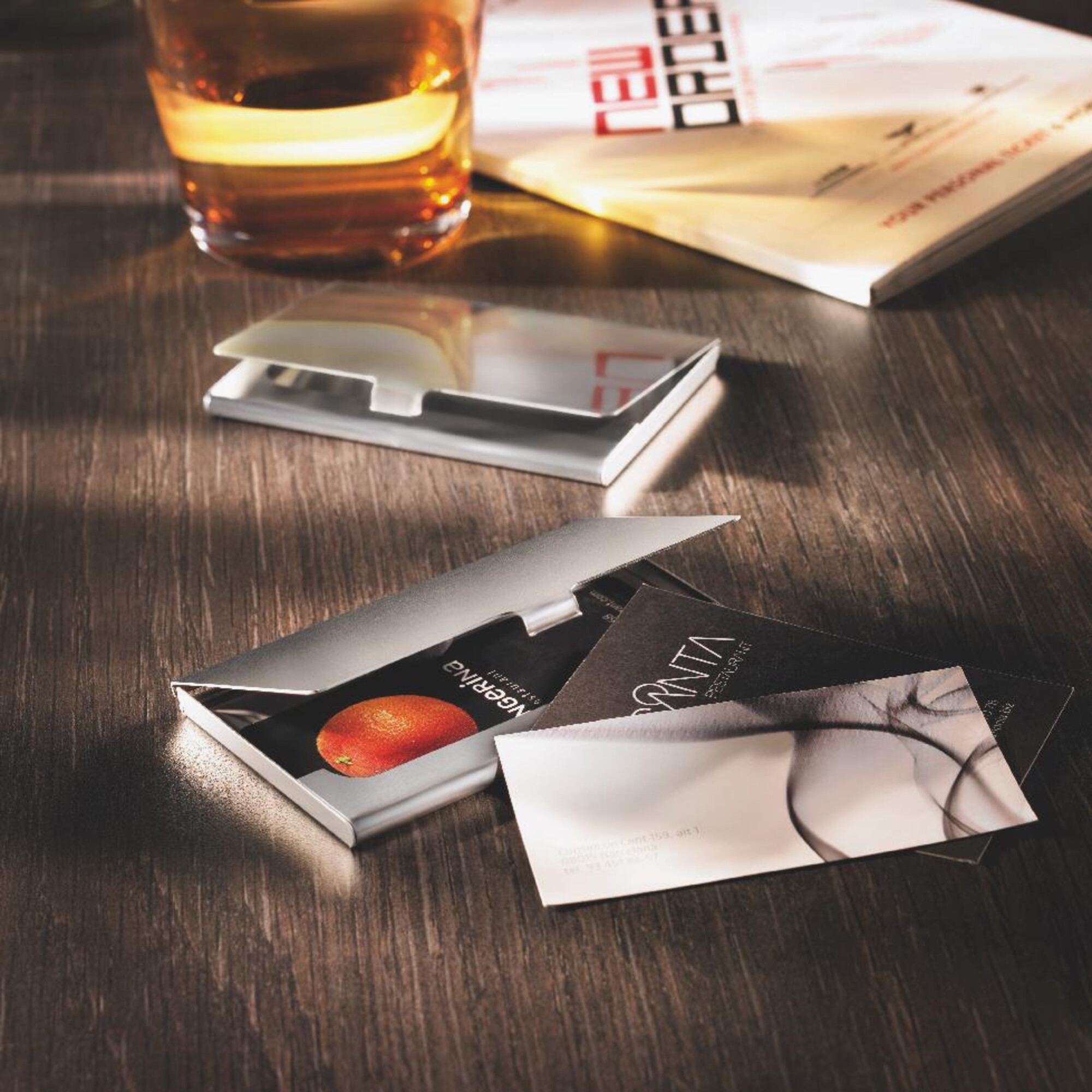 This metal business card holder features a high-gloss chrome-look finish. Its rigid structure protects business cards against bending, damage inside pockets.