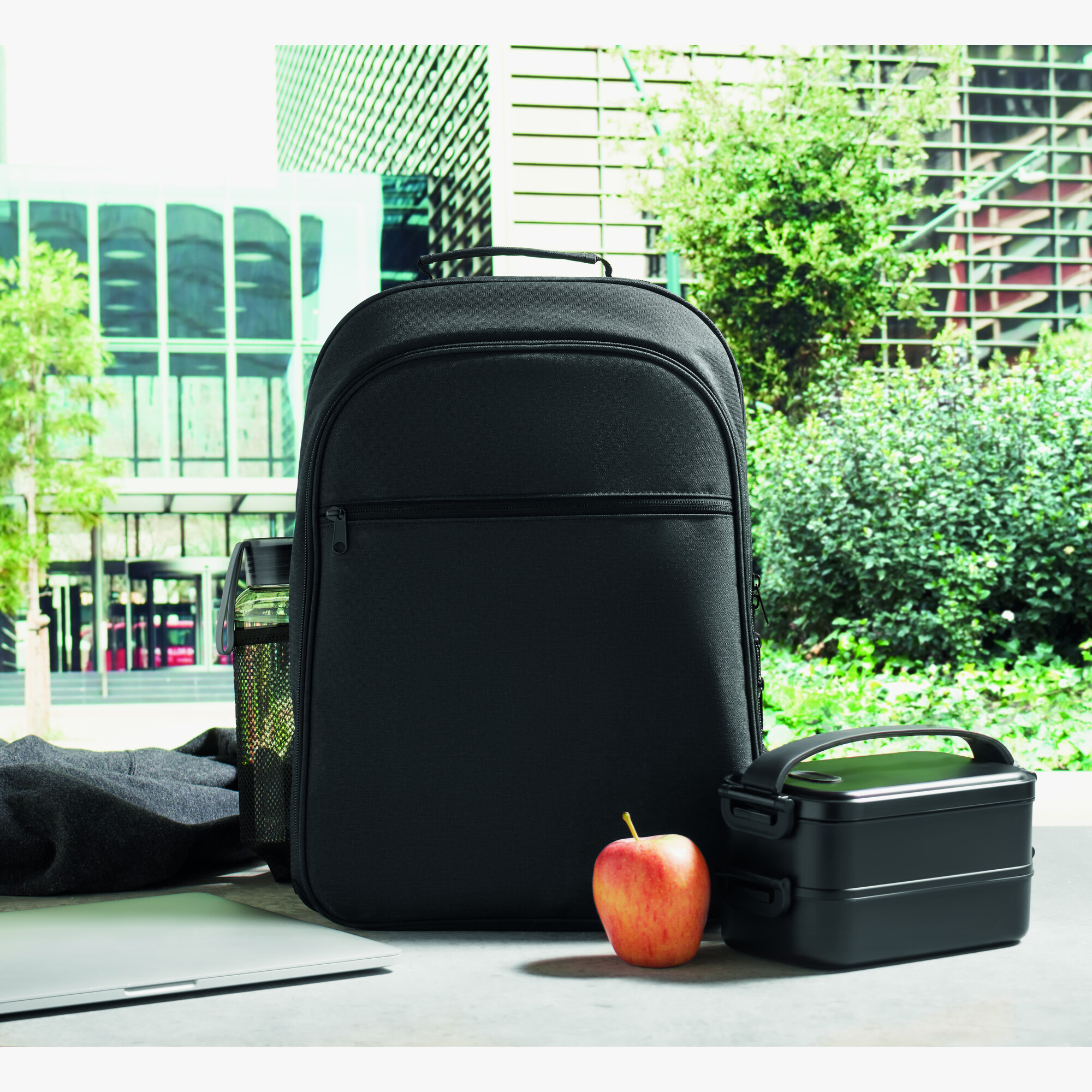 This cooler backpack in rPET polyester includes a padded 15 inch laptop compartment. It features a front zip pocket and a practical mesh side pocket.
