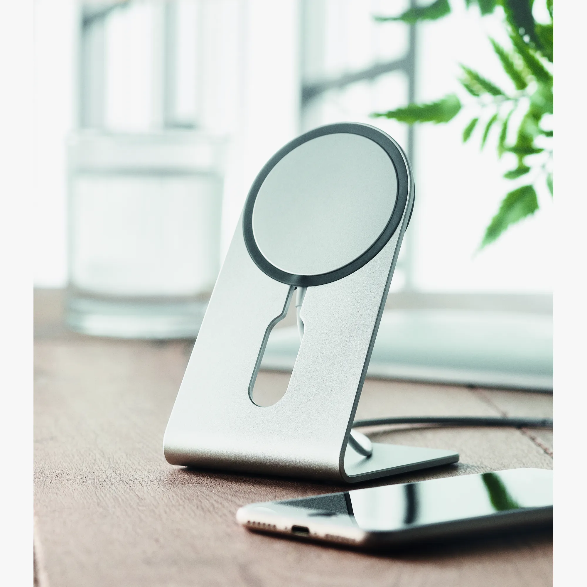 This aluminium wireless charger delivers 15W power. It includes an extra magnetic ring to support charging on devices without built-in magnets.