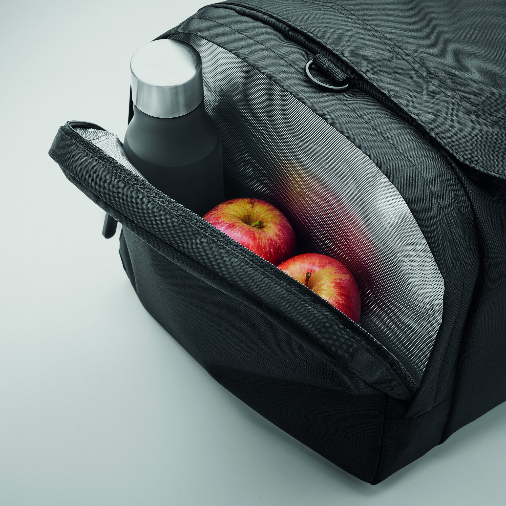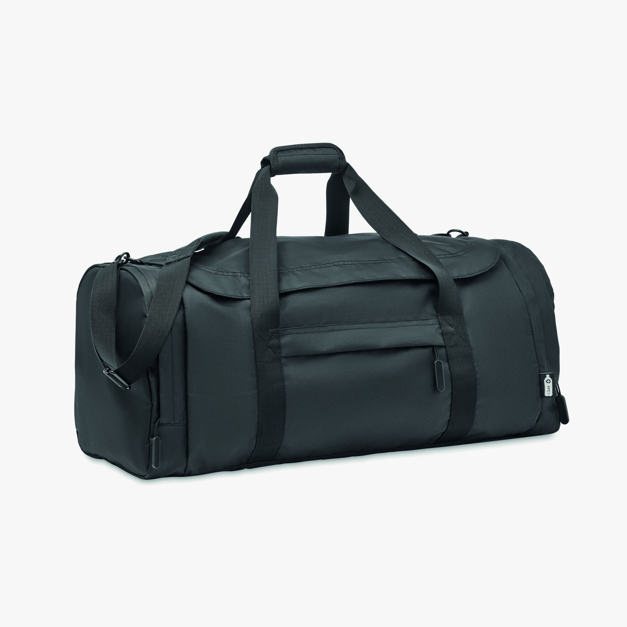 This travel bag in 300D rPET polyester includes a side compartment with cooling function. It features a removable reinforced base, an adjustable strap and multiple inner dividers.