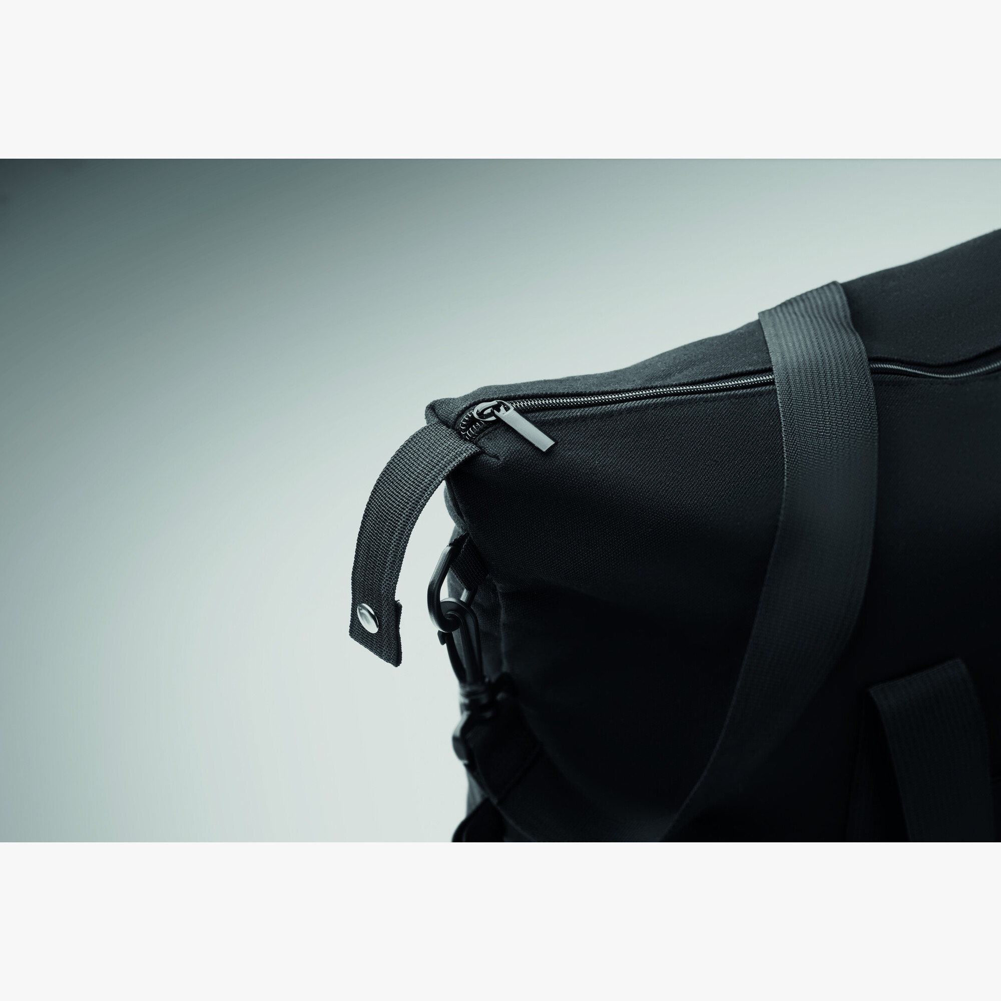 This weekend bag is made from recycled cotton and recycled polyester with a 210D rPET lining. It includes multiple pockets, a padded base, an adjustable strap and a trolley strap.